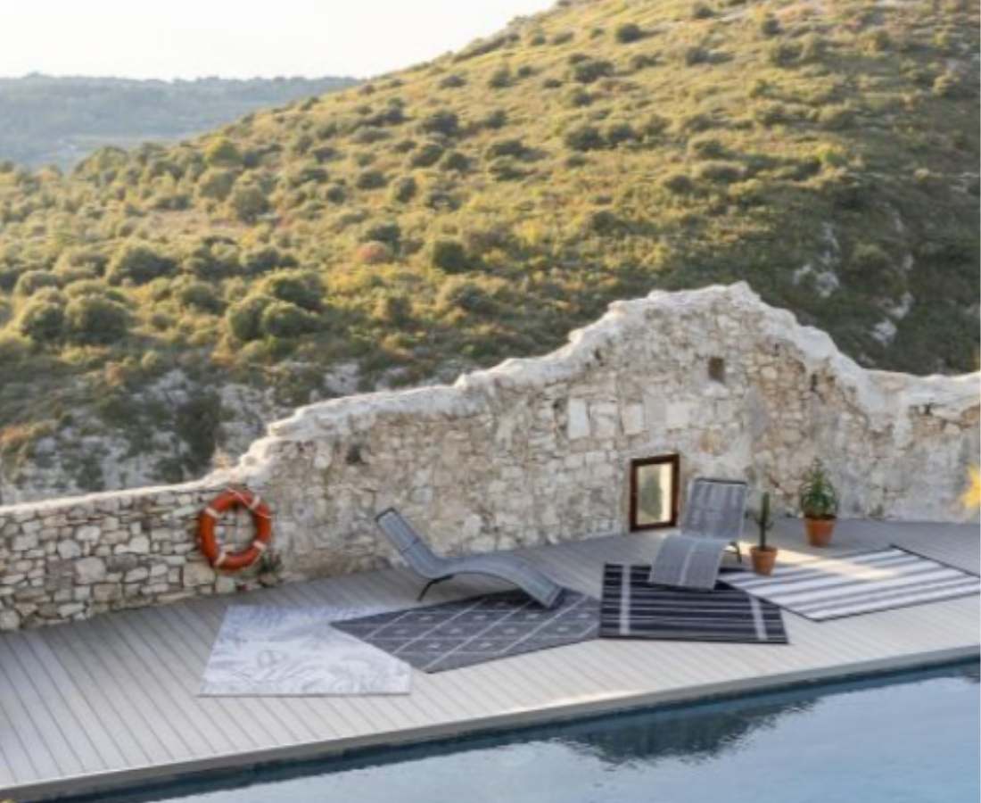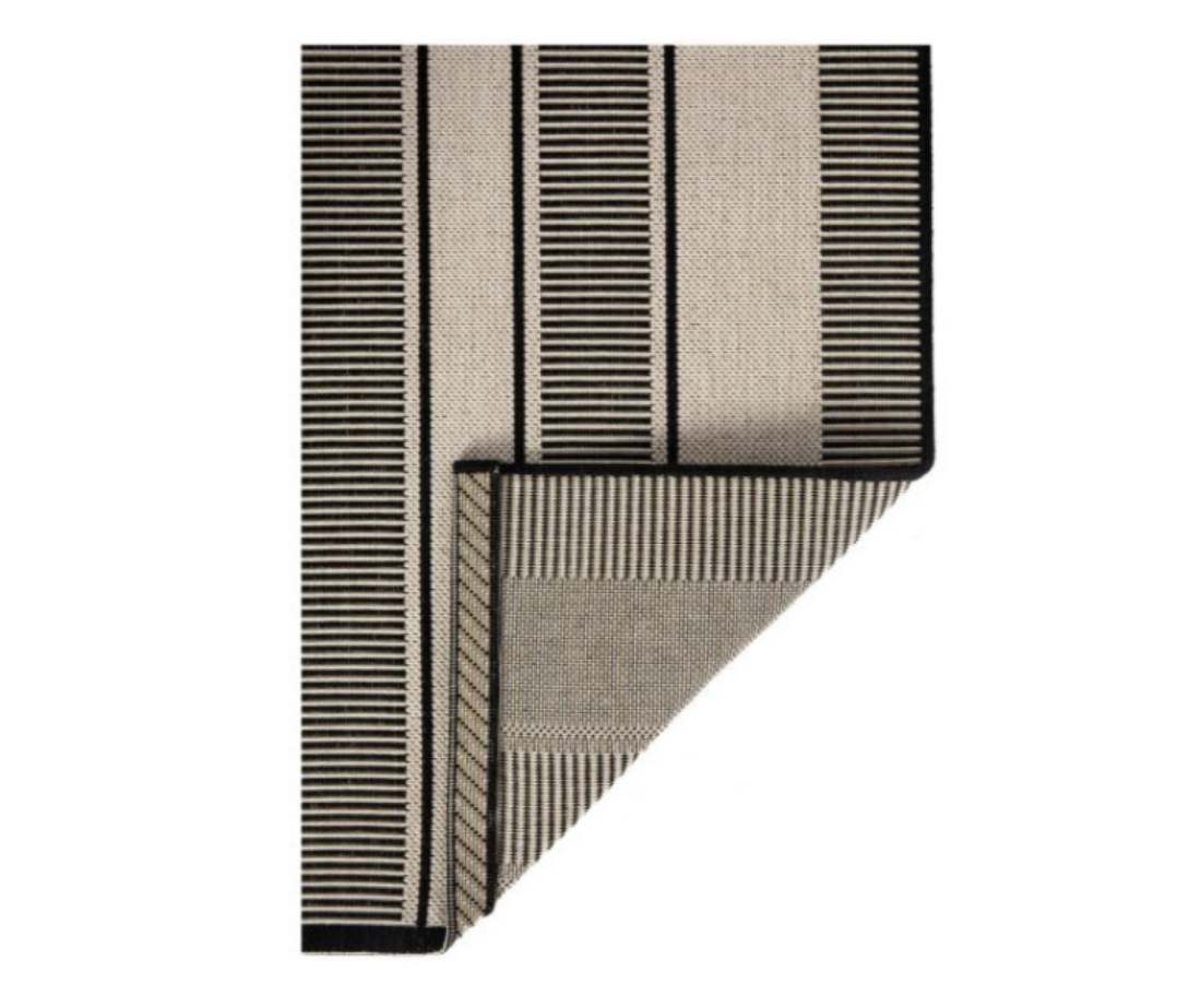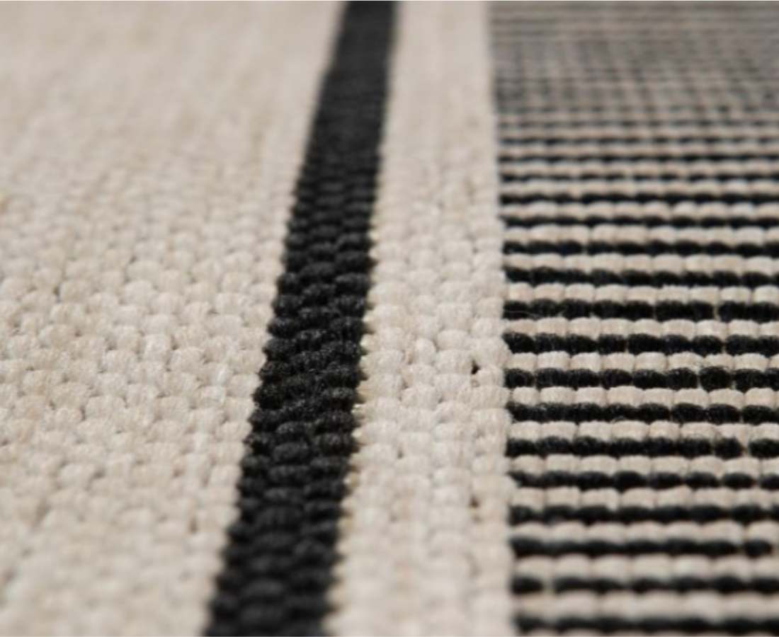 Notre tapis PAOMIA graphique au motif à rayures qui décorera les sols de vos espaces extérieurs avec style et modernité.